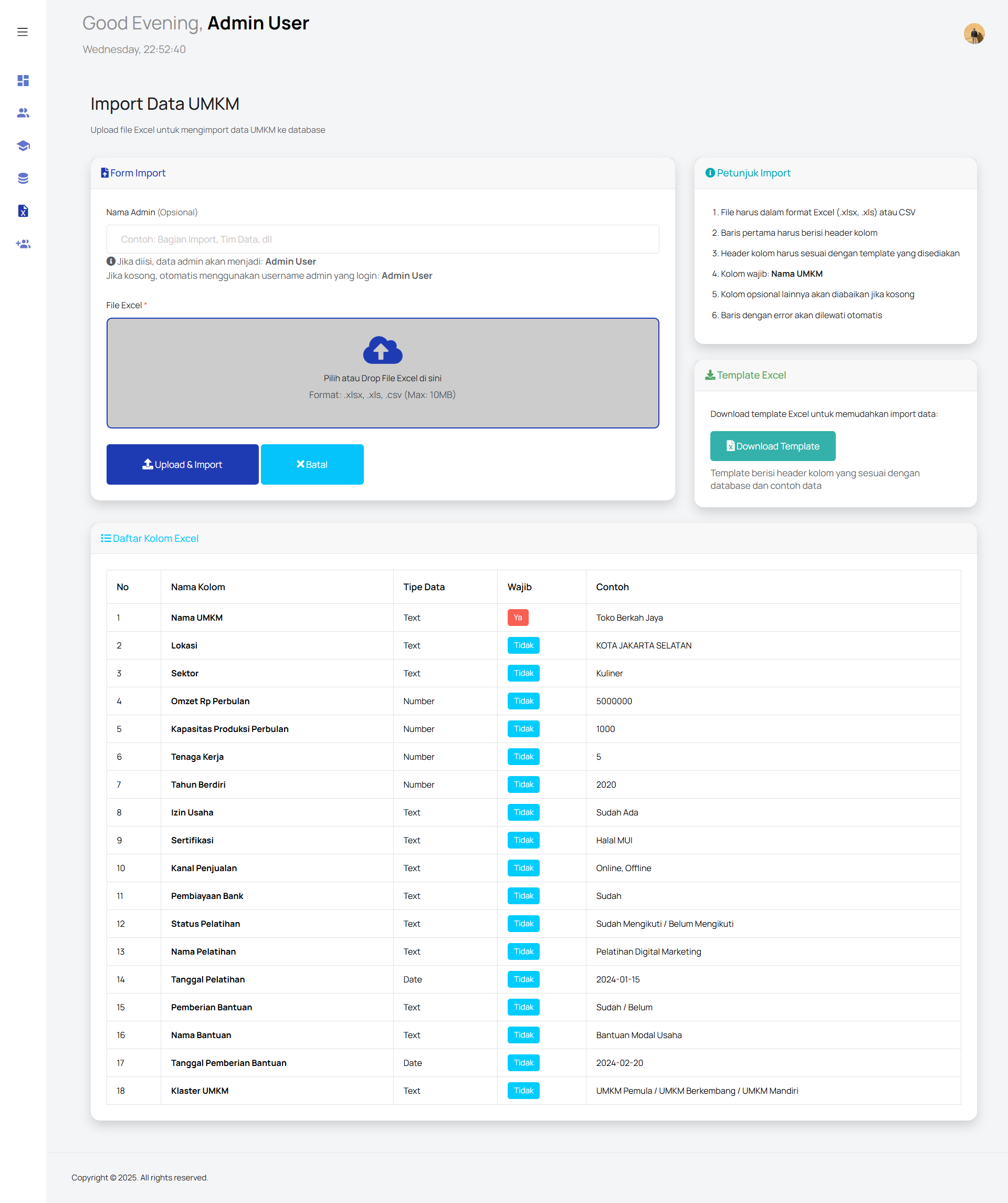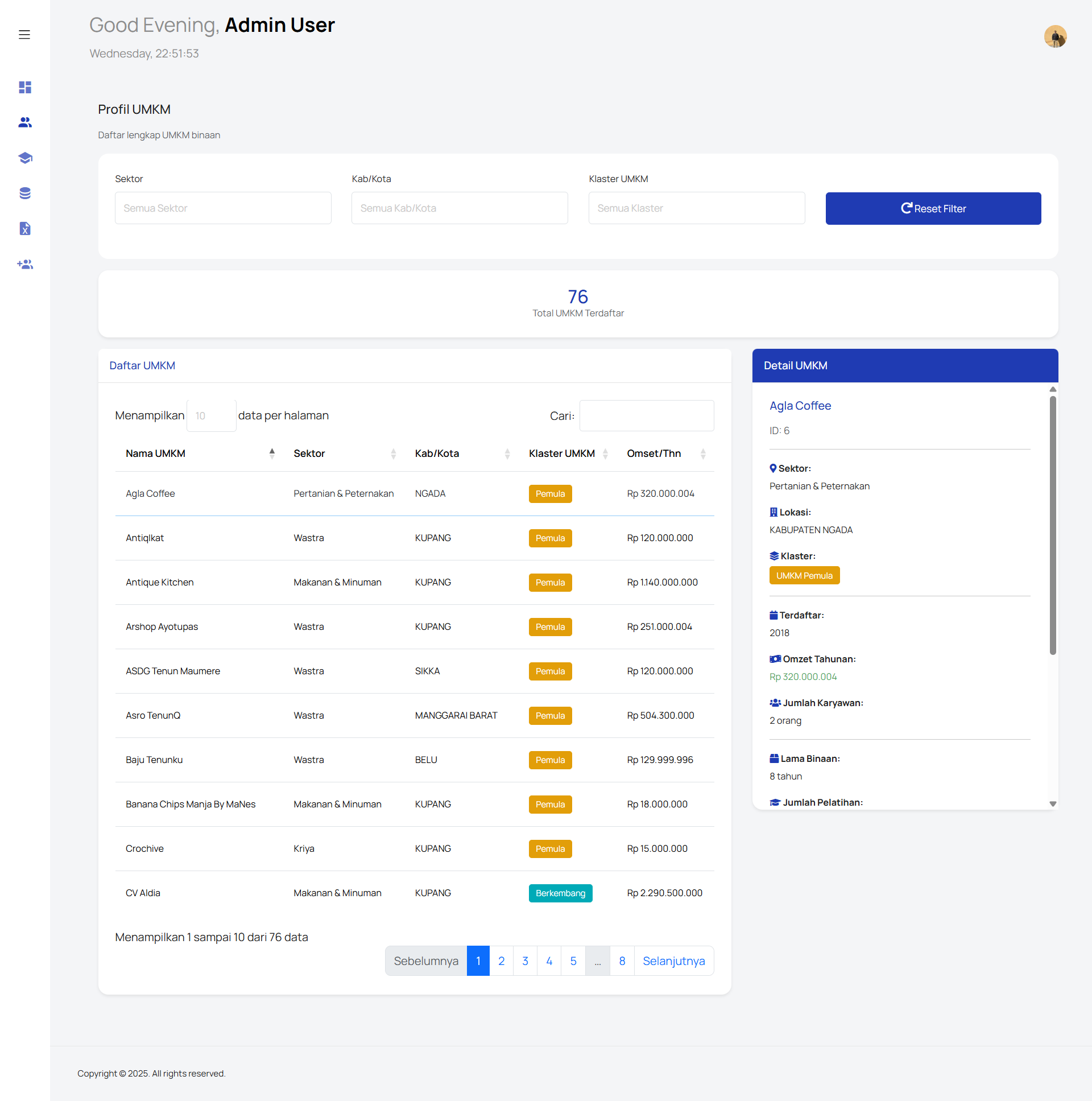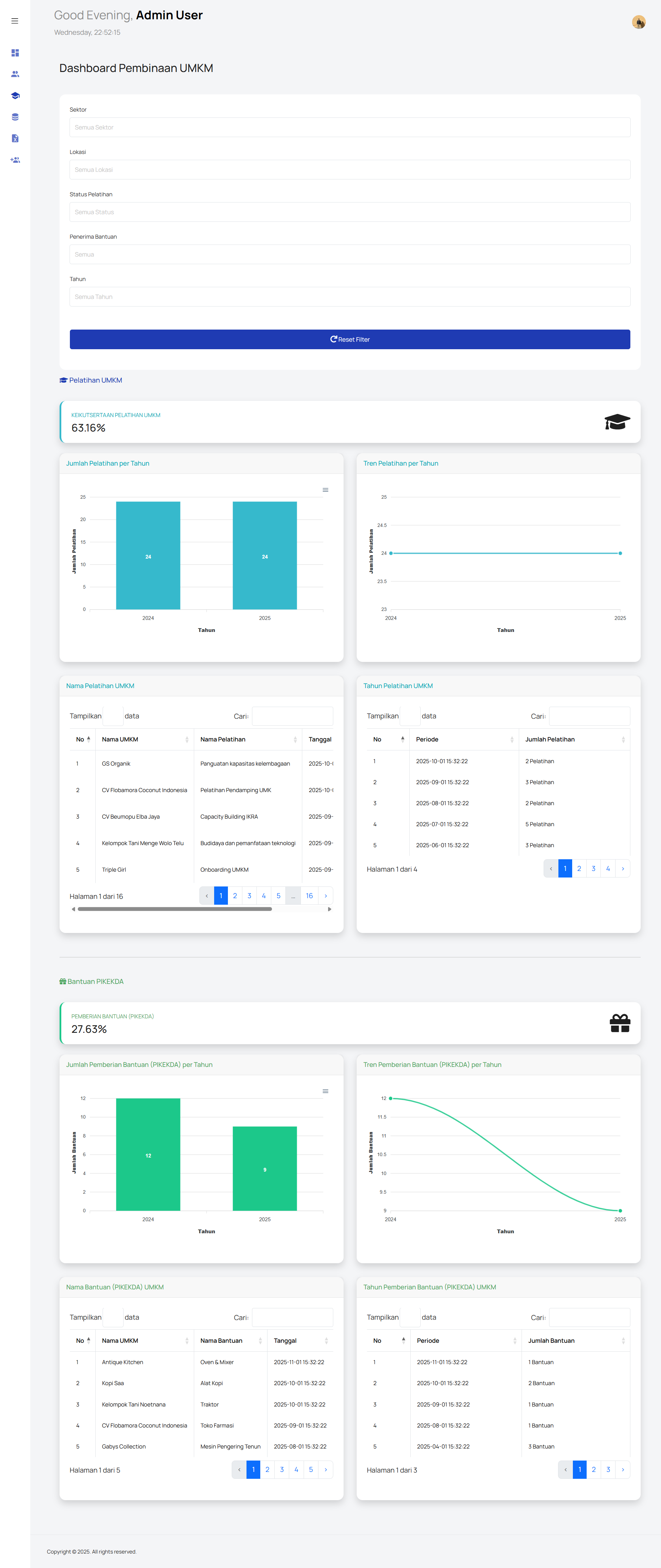 UMKM Monitoring & Management Dashboard is a web-based administrative system designed to manage, monitor, and analyze MSME (UMKM) data comprehensively. The platform provides an interactive dashboard that visualizes key metrics such as total registered UMKM, sector distribution, business clusters, revenue ranges, training participation, and government assistance programs. The system includes detailed UMKM profiles with filtering by sector, location, cluster, and business scale, enabling administrators to access structured and accurate business data efficiently. Advanced data visualizations such as charts, histograms, and geographic distribution maps support data-driven decision-making. Additionally, the platform features training and assistance monitoring modules, tracking participation trends and support distribution over time. An Excel import functionality is provided to streamline bulk data entry with validation rules and predefined templates, ensuring data consistency and accuracy. Designed with a clean, responsive interface and user-friendly navigation, this system supports digital governance, reporting, and strategic planning for UMKM development programs.