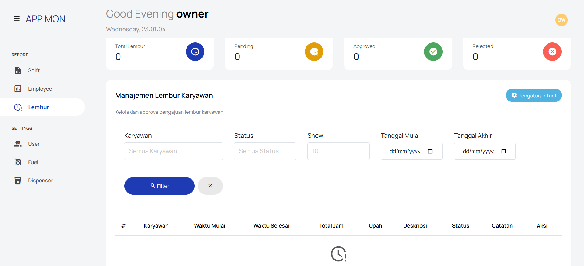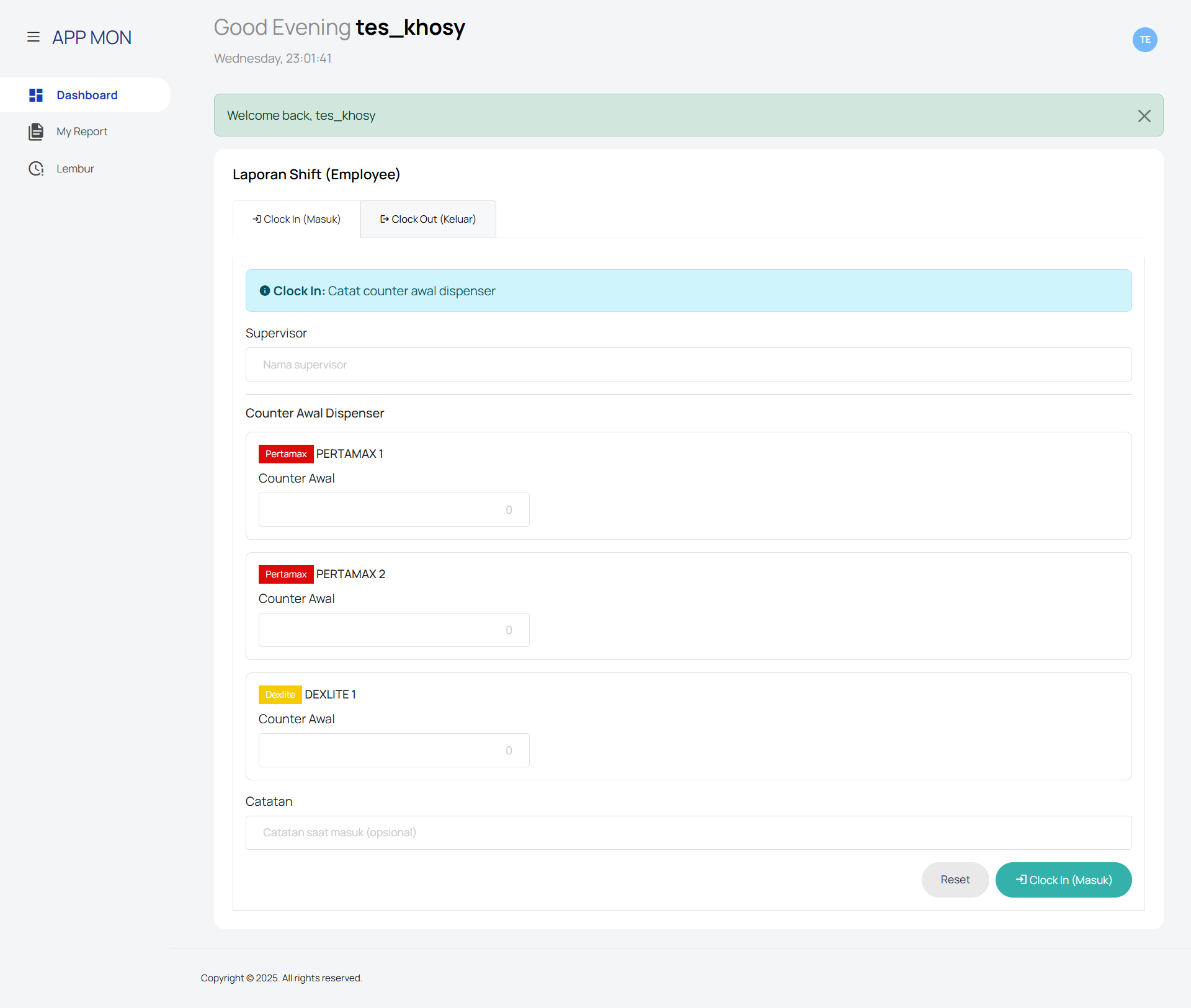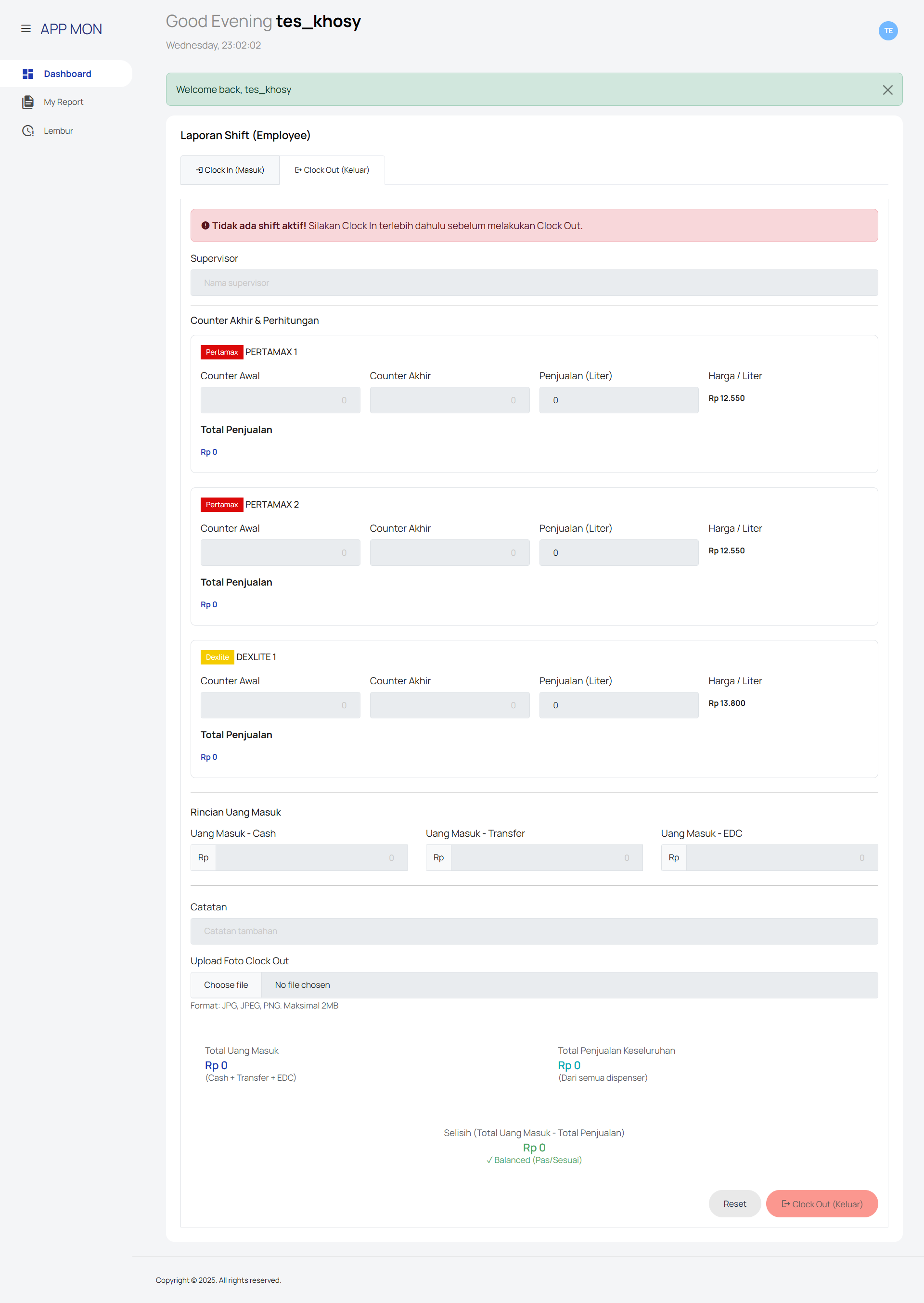 APP MONITORING – Shift & Overtime Monitoring System is a web-based operational management system designed to monitor employee shifts, fuel dispenser transactions, and overtime activities in a structured and transparent manner. The application supports both owner/admin and employee roles, each with tailored access and functionality. For management users, the system provides comprehensive dashboards to track shift reports, employee performance, overtime requests, and operational summaries. Key features include shift status monitoring (in progress, completed, cancelled), detailed sales reconciliation per dispenser, overtime approval workflows, configurable overtime rates, and Excel export for reporting and auditing purposes. For employees, the platform offers a guided shift workflow with secure clock-in and clock-out processes, including initial and final dispenser counter input, automated sales calculation based on fuel prices, cash and non-cash payment reconciliation (cash, transfer, EDC), photo upload for verification, and real-time balance validation to ensure accurate reporting. Built with a clean, intuitive, and responsive user interface, APP MON improves operational accuracy, accountability, and efficiency. The system is suitable for fuel stations or operational businesses that require precise shift tracking, financial reconciliation, and workforce overtime management in a centralized digital platform.