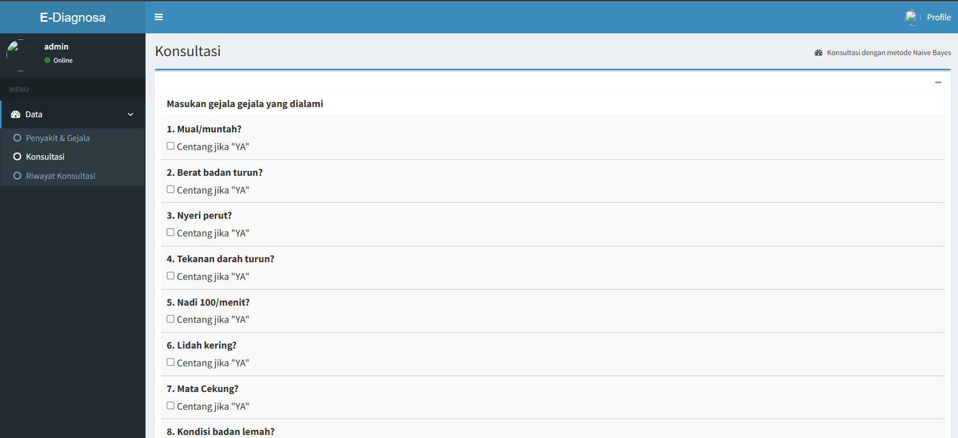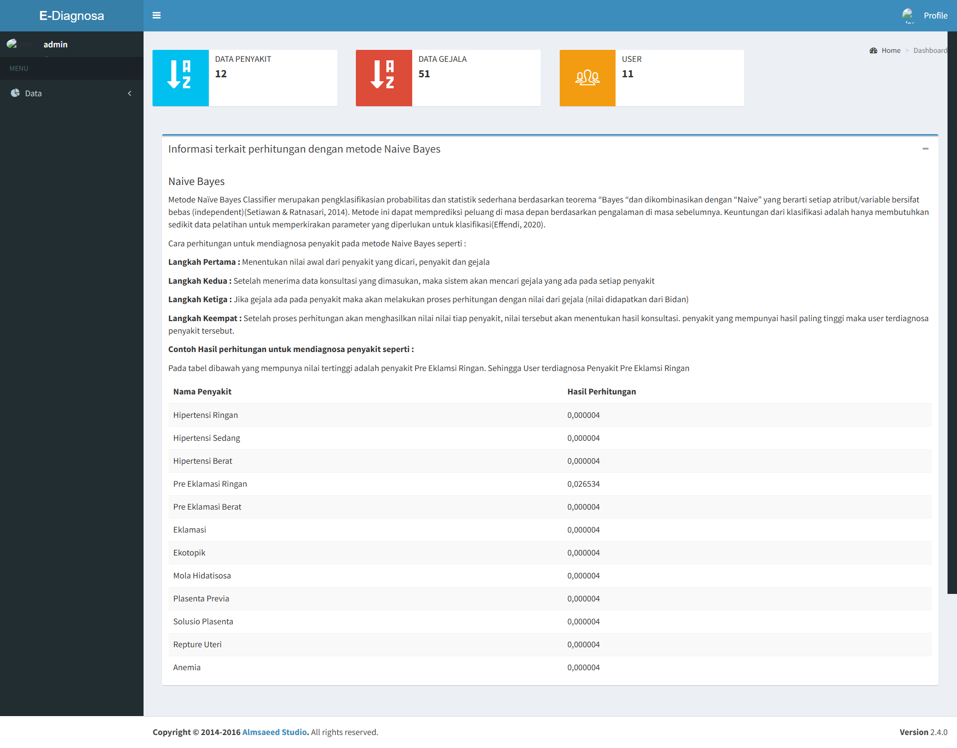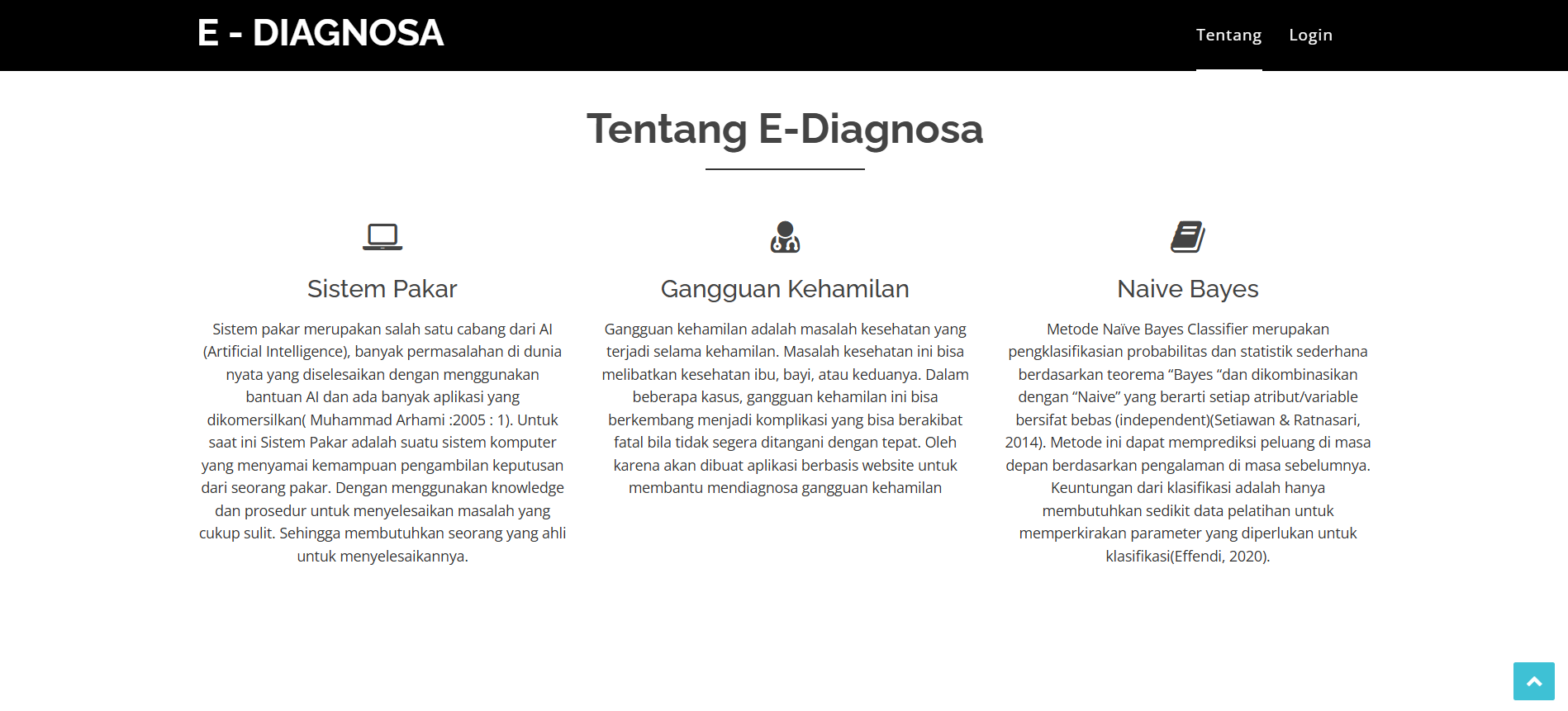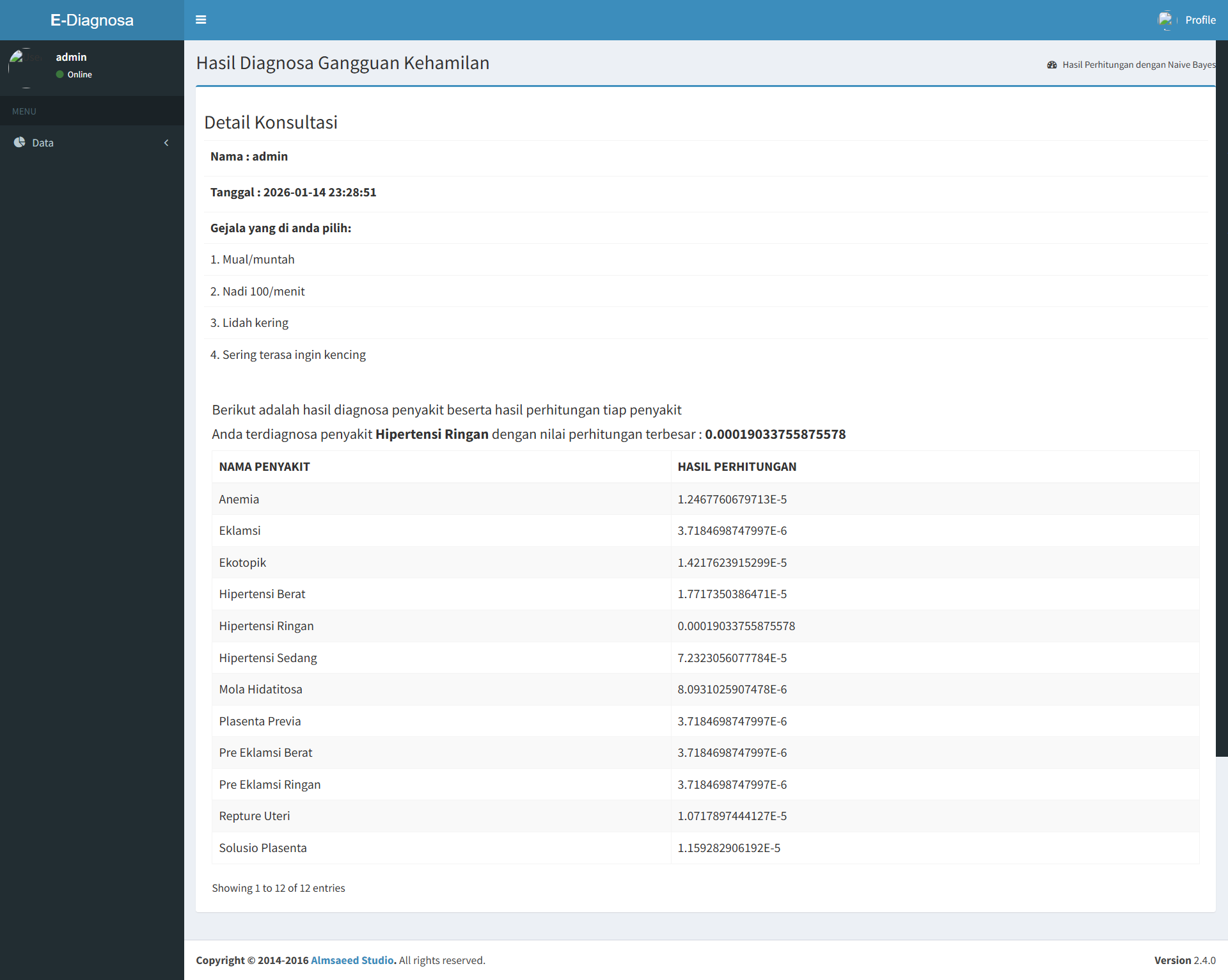 E-Diagnosa – Pregnancy Disorder Expert System is a web-based expert system developed to assist in the early diagnosis of pregnancy-related disorders using an artificial intelligence approach. The system applies the Naive Bayes Classifier method to analyze user-selected symptoms and calculate the probability of potential pregnancy complications. Users can perform consultations by selecting experienced symptoms through a structured questionnaire. The system processes these inputs using probabilistic calculations and presents diagnostic results ranked by likelihood, along with detailed computation outcomes for each possible condition. This approach helps provide transparent and explainable diagnostic results. The application includes an administrative dashboard for managing disease data, symptom datasets, user records, and consultation history. Administrators can monitor system usage, update medical knowledge bases, and review diagnostic calculations to ensure data accuracy and consistency. Designed as an academic and applied research project, this system demonstrates the practical implementation of artificial intelligence in healthcare decision support. With a clean and structured interface, the platform serves as a digital tool for educational purposes, early screening assistance, and research in expert systems and medical informatics.